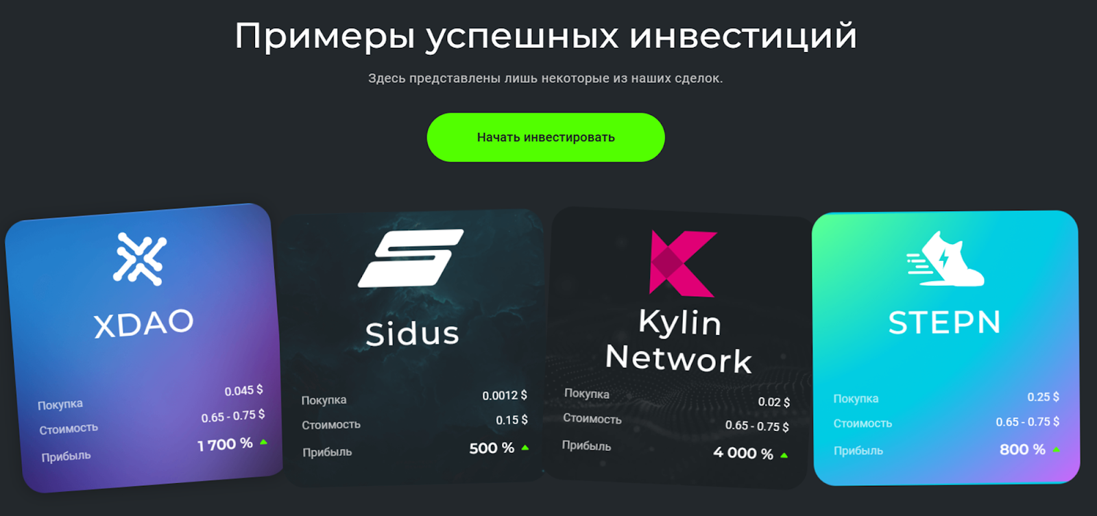 Захватывает новичков и продвинутых, от блогеров до трейдеров, примерами успешных кейсов с результатом в +4К% доходности. Однако верифицированных результатов в подтверждение своих слов компания не предоставляет.