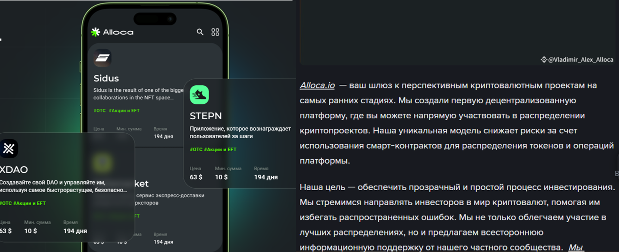 Со слов авторов проекта, Alloca помогает инвесторам объединяться для покупки лотов на пресейл и распределяет токены через смарт‑контракты. Есть обучающий контент, блог, AI‑Consigliere советник на базе ML, который раздает рекомендации и аналитику. Работают с эксклюзивными стартапами: STEPN, XDAO и др., указанными в интерфейсе проекта.
