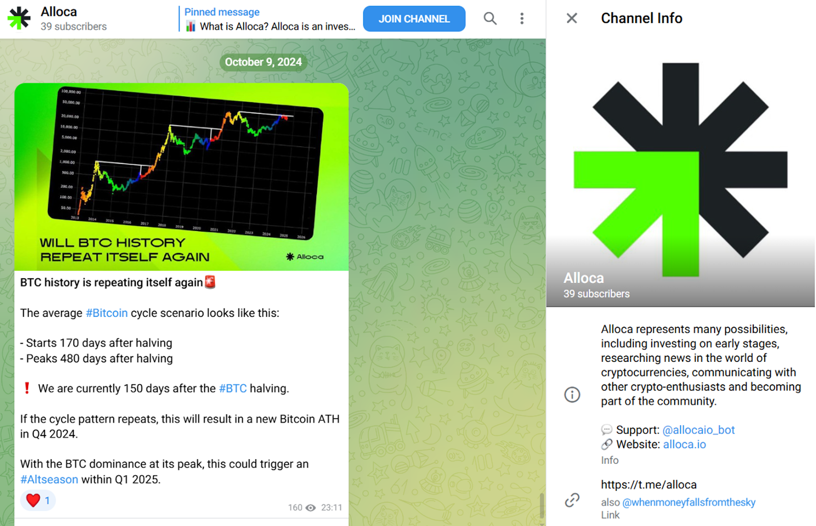 На момент проверки у проекта есть ТГ канал с 39 подписчиками — ламповый размер для тест‑площадки. Канал слишком мал для заявленных амбиций. А судя по контенту, паблик является трафик‑воронкой, ведущей на платформу alloca io.