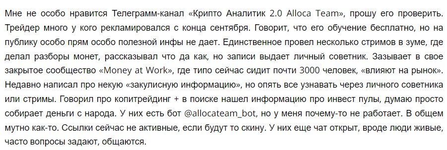 На сторонних сайтах отзывов об Alloca Team нет, встречаются только запросы на проверку от пользователей, которые подозревают канал в нечестности.
