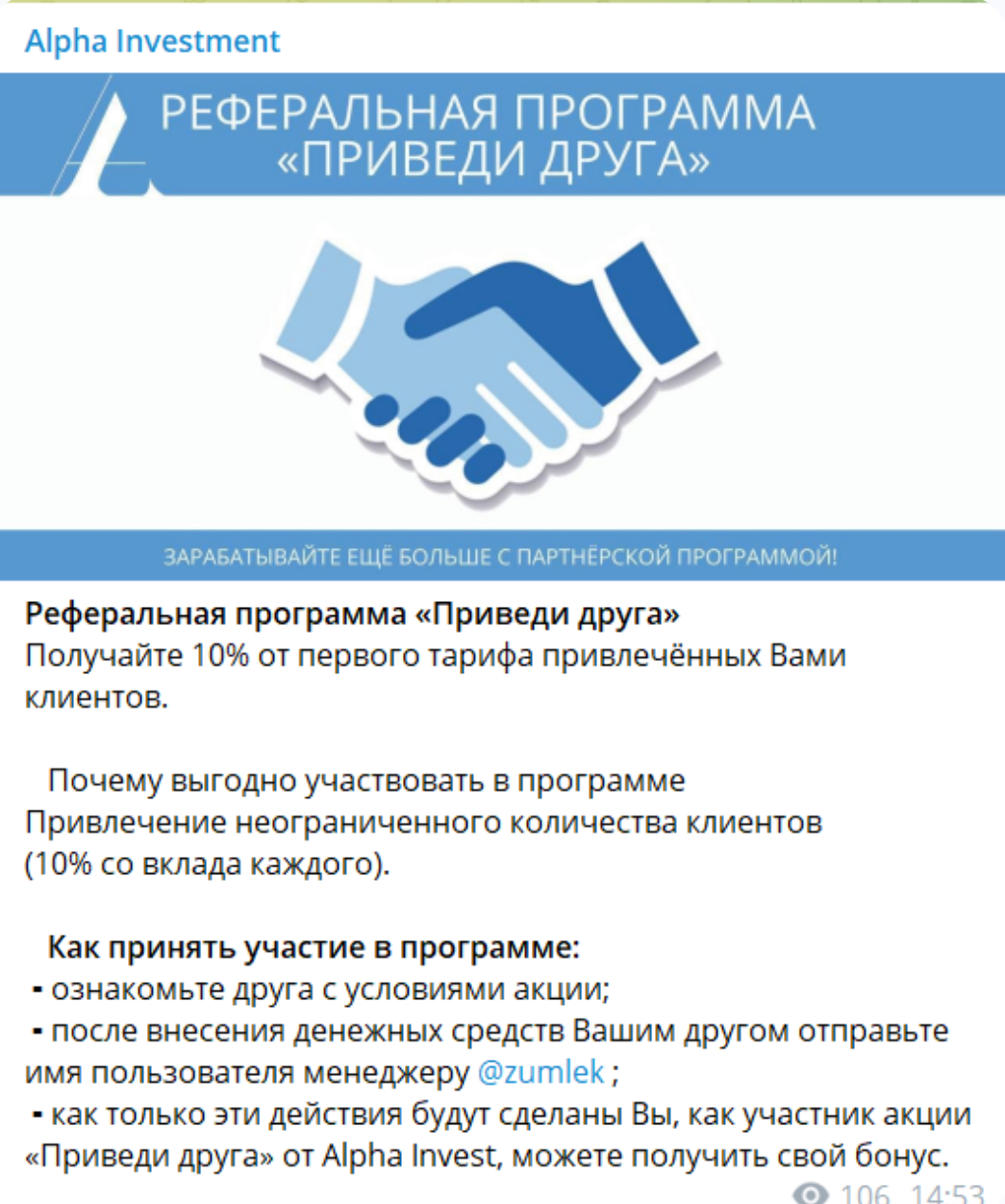 Активное продвижение реферальной программы «Приведи друга» можно заметить в тг-канале. Клиент сможет получать 10% от первого тарифа друга. После ознакомления партнера с условиями акции и внесения денежных средств необходимо обратиться к админу, ему нужно отправить имя пользователя.