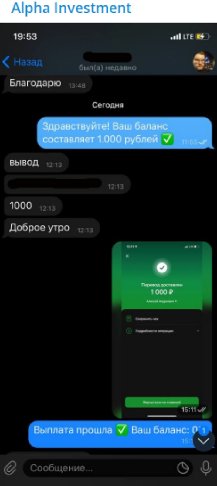 Для того, чтобы получить доверие клиентов, автор публиковал скрины общения с пользователями. Там были прикреплены якобы успешные переводы с банков на счета участников. Однако такие переписки легко подделать. Аферисты занимаются этим ради улучшения своей репутации у новичков.
