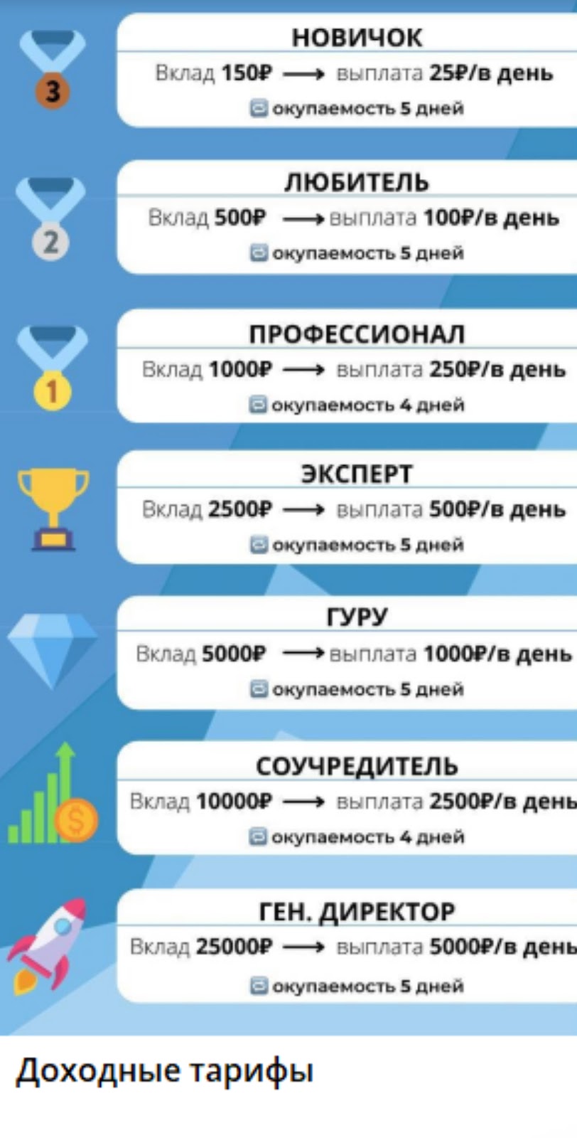 - Соучредитель — при вкладе 10 000 тысяч рублей, прибыль 2 500 ежедневно;