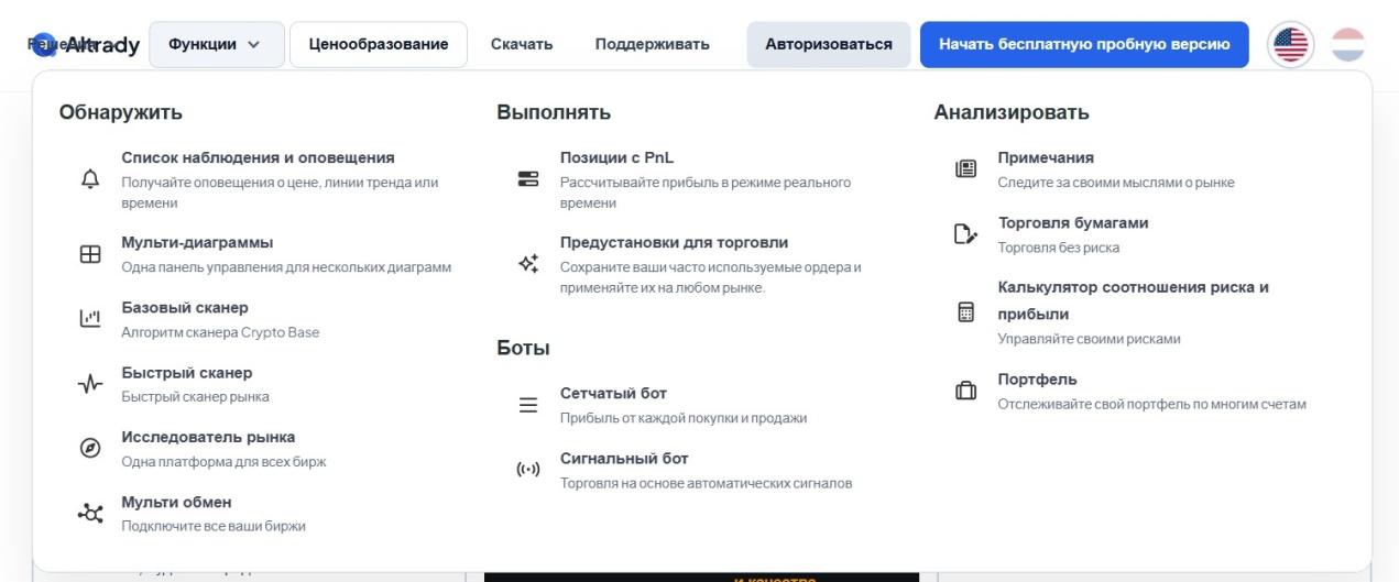 Торговая платформа Altrady представлена на сайте altrady com. Здесь можно торговать на 9 биржах криптовалют, включая Binance, OKX, KuCoin, Poloniex иных. В распоряжении клиентов разные торговые боты, торговые счета, сканеры, индикаторы и прочие инструменты для криптотрейдинга. Владельцы обещают прозрачные условия сотрудничества и надежность финансовой платформы.