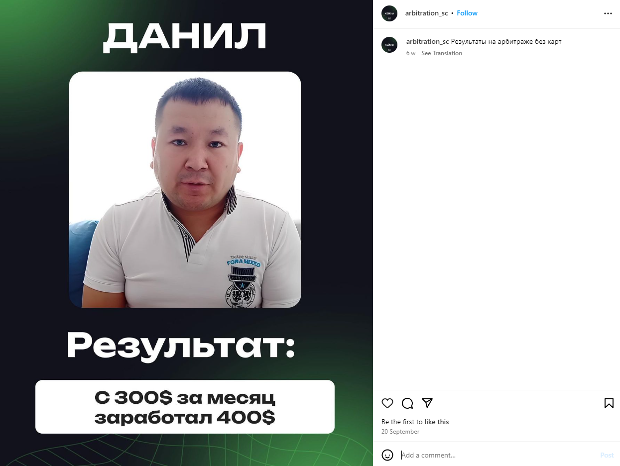 Для перелива трафика он ведет Instagram аккаунт, где есть посты посвященные сотрудничеству и ссылка на основной проект arbitration sc. Он не располагает ценной информацией, а только предлагает заполнить анкету для дальнейшего сотрудничества. В ней вы должны указать свои контактные данные, уровень заработка и ожидания, после чего с вами якобы должен связаться менеджер.