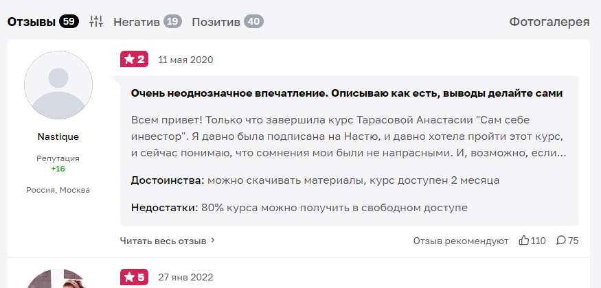 Мнения клиентов, отзывы о проекте Инвестиции С Нуля Анастасии Тарасовой
