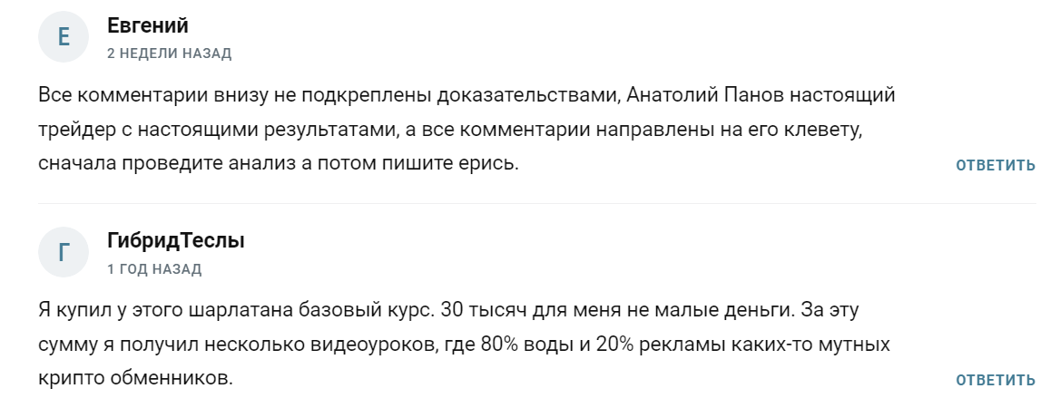 Однако негативные отзывы о Анатолии Панове тоже есть. Клиенты трейдера говорят, что стоимость курса сильно завышена, а всю информацию из него можно найти в открытом доступе.
