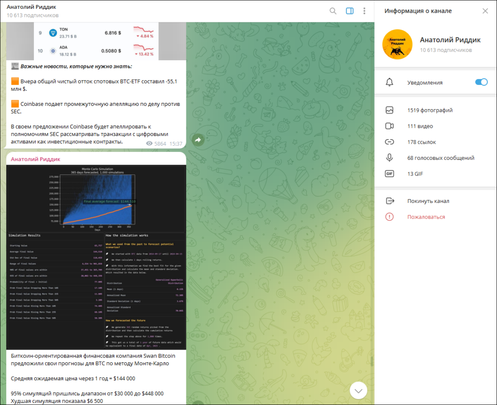 Анатолий Риддик представляется профессиональным трейдером с командой, давно работающей с криптовалютным рынком. Его канал существует больше двух лет и за это время там собралась аудитория свыше 10 тысяч человек. В публикациях даются торговые сигналы с указанием точек входа, целевых уровней, стоп-лоссов и используемого плеча.