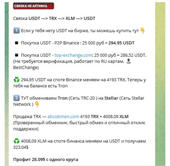 Контент состоял из сплошных бесплатных арбитражных связок. Обычно в них включали обменники и криптовалютные биржи, через которые и предлагали прогонять связки. Также периодически Анатолий писал об арбитраже, рассказывая, какое это прибыльное и простое занятие.