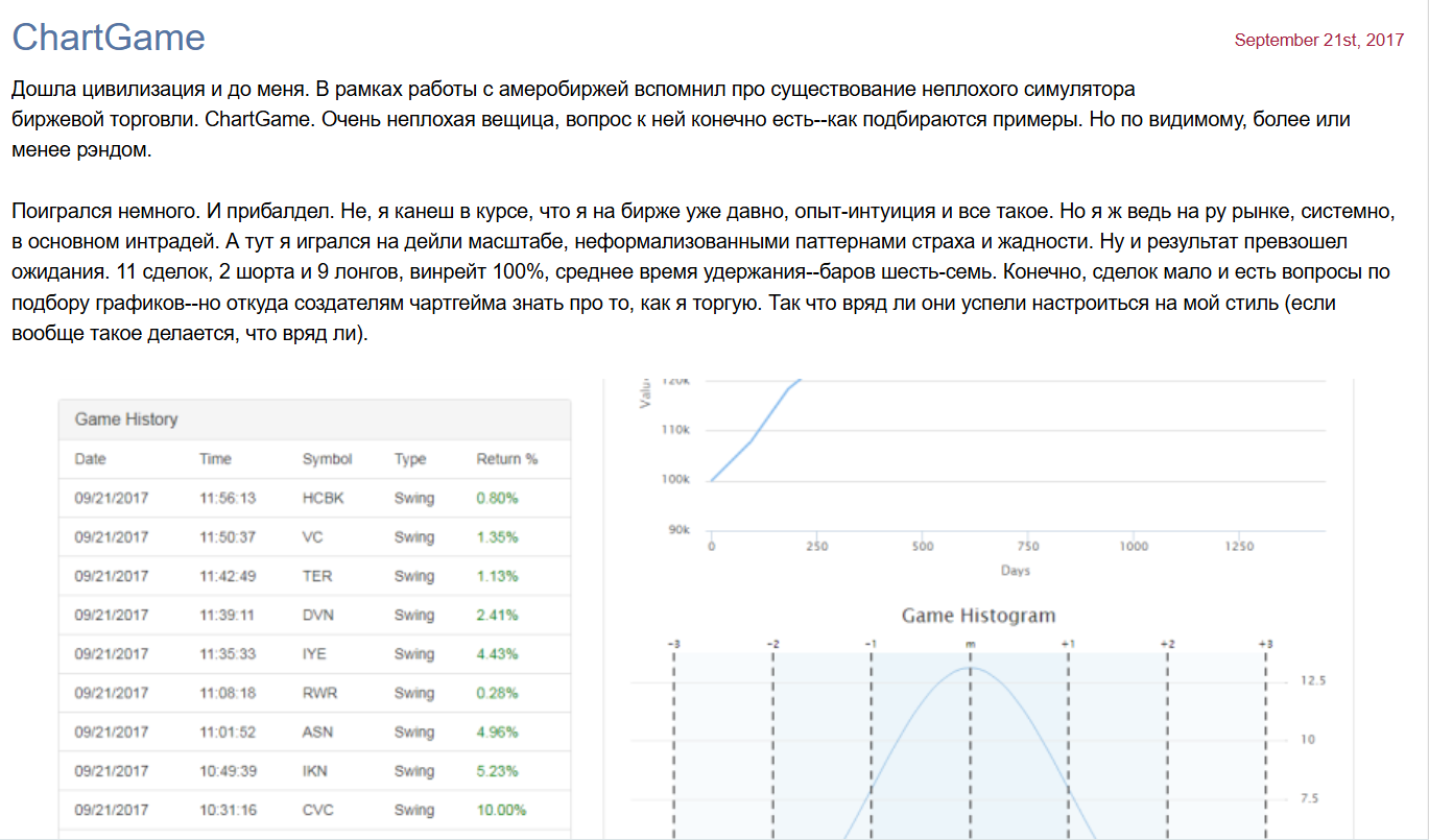 В публикациях 2017-2020 годов трейдер делится примерами вроде симуляции в ChartGame с заявленным 100% винрейтом на 11 сделках. Но он подчеркивает, что это не реальная торговля, а игра. Это делает материал скорее развлекательным, чем полезным. К 2023 году акцент в записях смещается на личные путешествия с PDF-отчетами.