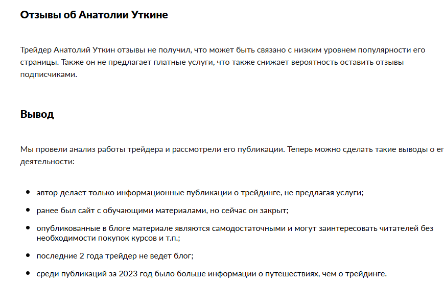 Материалы представлены как бесплатные публикации, и в них отсутствуют призывы к покупке. Однако в профиле блога ранее указывалась ссылка на внешний сайт с материалами по обучению трейдингу, который на текущий момент неактивен. Стоит отметить, что Уткин не предоставляет доказательств эффективности своих методов. Поиск не выявляет упоминаний о платных услугах от Анатолия. Но наличие неактивной ссылки на обучающий сайт предполагает, что в прошлом могла существовать попытка монетизации через расширенный контент, который теперь недоступен.