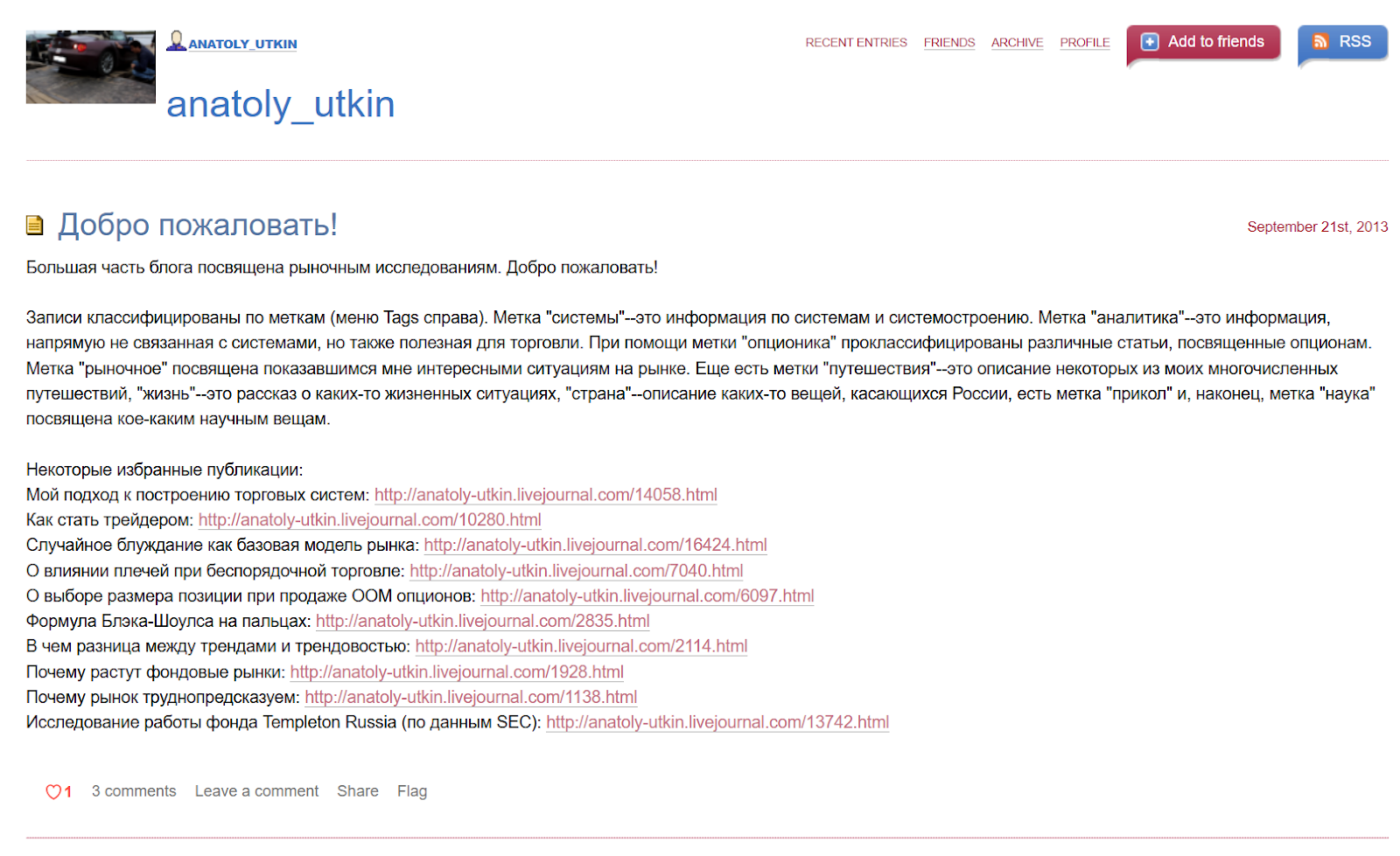 Анатолий Уткин занимается самостоятельными исследованиями финансовых рынков. Своими наблюдениями делится в блоге на LiveJournal. Там он пишет под ником anatoly utkin. Здесь есть информация по анализу рыночных ситуаций, моделям поведения цен и аспектам торговли на бирже.