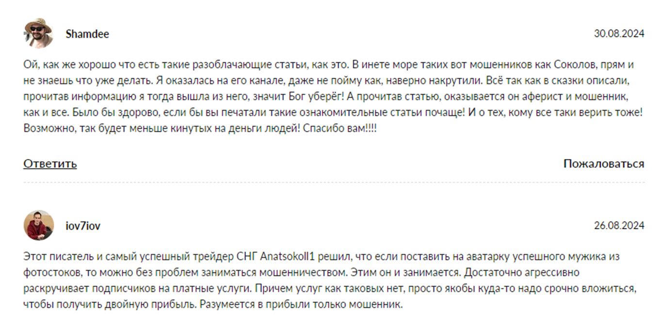 На Anatsokoll1 отзывы по большей части отрицательные. Пользователи уверяют, что мужчина мошенник и доверия не заслуживает, делятся историями потери денег.