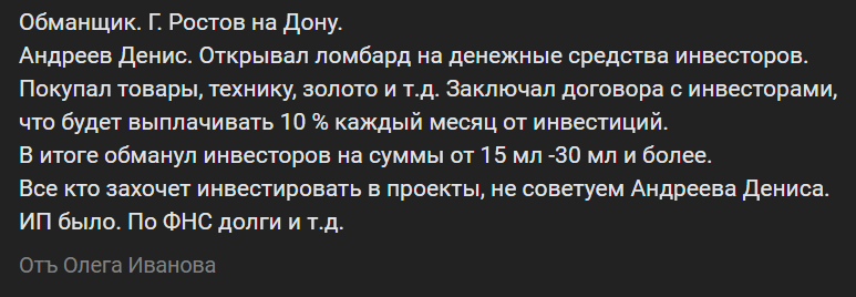 Условия вкладов, которые собирал инвестор Денис Андреев в Ростове, предполагали щедрые дивиденды. В частности, обещалась выплата 10% в месяц от вложенных средств. Такие крупные суммы должны были получаться за счет оборота ломбарда. Именно под ломбарды и были взяты деньги. Проверка показывает, что по ФНС данного инвестора есть много долгов. Также есть информация о большом количестве судебных разбирательств в отношении данного инвестора.В среднем предполагается, что Andreev Denis взял 15-30 миллионов рублей инвестиций. Они не были возвращены и дивиденды по ним не выплачивались. Соответственно, практически все разбирательства в суде и долги числятся по его основной инвестиционной деятельности. На данный момент Денис Андреев из Ростова-на-Дону скрывается от инвесторов и не выходит на связь.