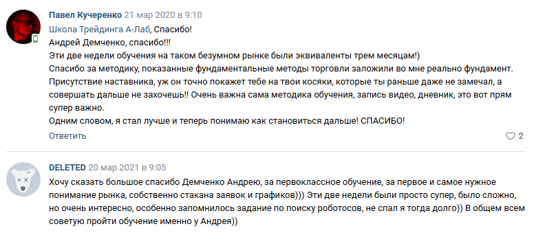 В ходе поиска независимых отзывов о самом Telegram-канале AndreikrdTrading в открытых источниках (специализированные форумы, сайты-отзовики) найти прямые оценки деятельности данного конкретного проекта не удалось. Однако присутствуют положительные отклики от учеников, которые благодарят Андрея за методику преподавания и помощь в понимании рынка.На странице школы «А-Лаб» во «ВКонтакте» тоже есть много теплых слов в адрес трейдера Демченко.