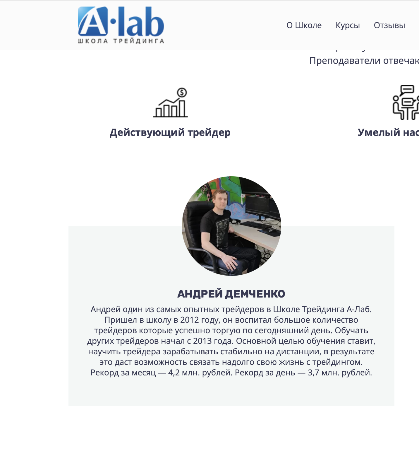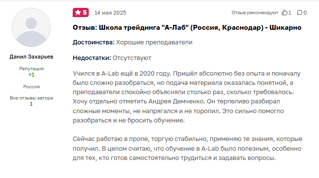 Несмотря на опыт работы в «А-Лаб», верифицированные данные о результатах торговли самого Андрея Демченко в открытом доступе тоже отсутствуют. Скриншоты из торговой платформы, как отмечают наши эксперты, легко подделать или предоставить с демо-счета. Но мы можем определить по открытым источникам достоинства Андрея Демченко как трейдера-преподавателя школы «А‑Лаб».