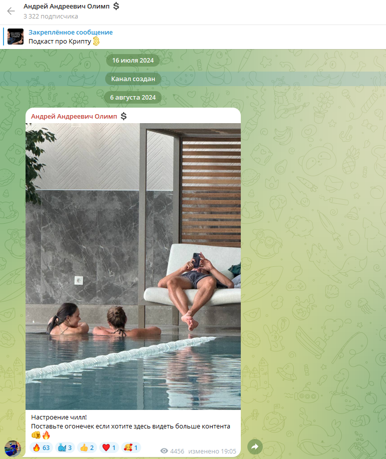 Канал о крипте «Андрей Андреевич Олимп» зарегистрировали в июле 2024 года, первые публикации размещены в августе. Примерно за 13 месяцев проект смог привлечь аудиторию в 3 322 человека.
