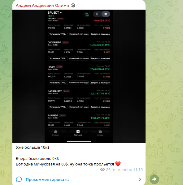 «Андрей Андреевич Олимп» в крипте – это телеграмм-канал, о котором в сети мало положительных или отрицательных отзывов. Проект создан трейдером, в рамках блога он показывает свои сделки и учит подписчиков зарабатывать прибыль.