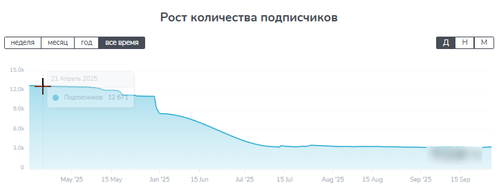 Негативное впечатление вызывает только динамика развития, так как с августа 2025 года канал о крипте «Андрей Андреевич Олимп» потерял около 9 000 подписчиков. При этом не было обнаружено рекламных объявлений, отсутствует информация о настоящих источниках трафика. Все это в совокупности может указывать на применение накрутки при продвижении.