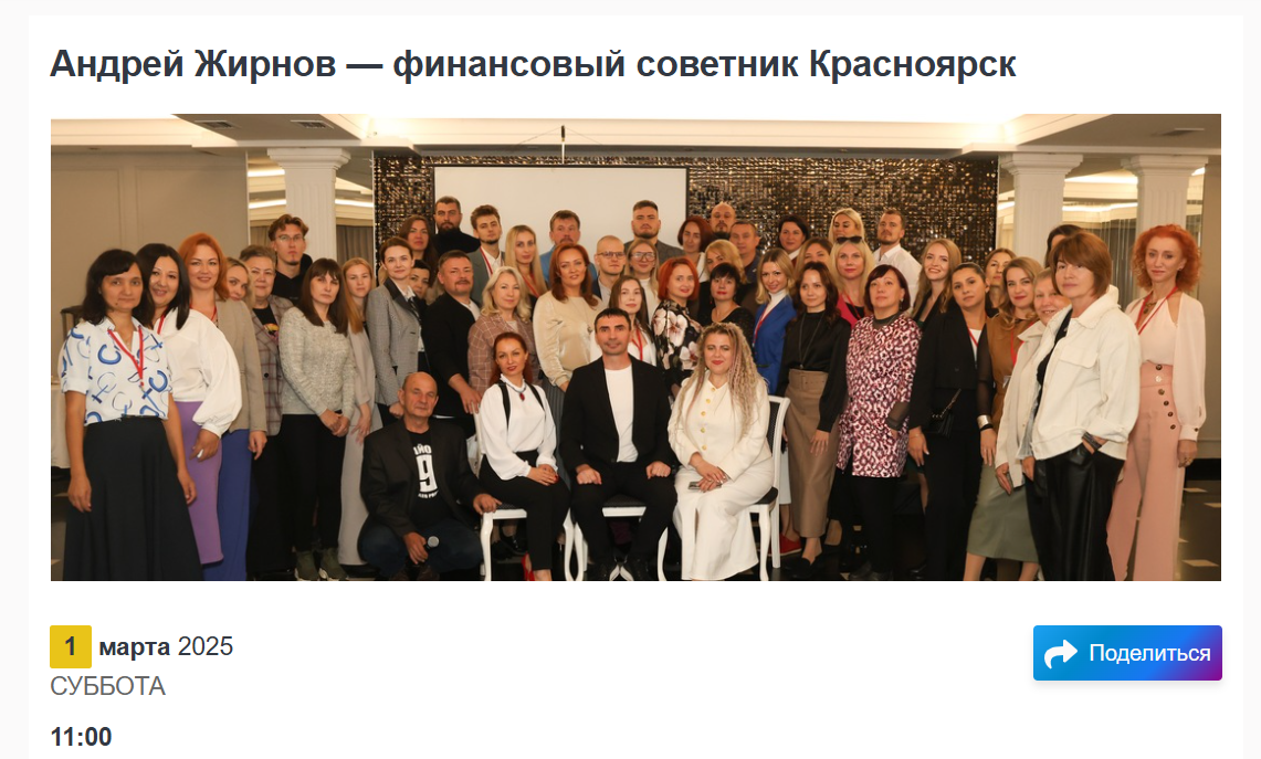 В ходе поиска информации о трейдере, мы нашли его объявление о встрече и нетворкинге с другими людьми из Красноярска, где и живет финансовый советник Андрей Жирнов. Там он обещает проработать максимально продуктивно и полностью посвятить мероприятие работе с аудиторией.