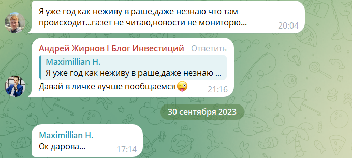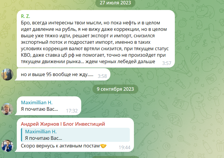В сети нет практически никакого упоминания деятельности финансового эксперта, из-за чего узнать более подробно о мнении его читателей и клиентов становится невозможно. Единственное, что могло бы прояснить ситуацию – комментарии из телеграмм-канала, пусть их и немного. Пользователи рассказывают собственное мнение на те или иные вопросы Андрея Жирнова, а также желают сами пообщаться напрямую с инвестором.