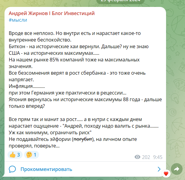 В телеграмм-канале Андрея Жирнова можно встретить упоминания собственных стратегий инвестирования, которые якобы использует сам владелец. Также помимо рекомендаций, на канале можно встретить и рассуждения о ситуациях на фондах, биржах и рынках. Все записи пишутся вручную, а значит пользователи точно получат информацию из первых уст.