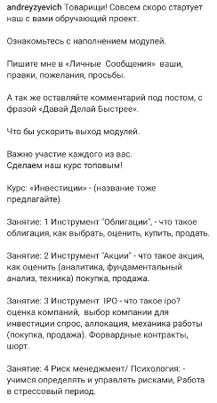 Темы, озвученные в рамках курса по инвестициям, довольно банальные. По ним сегодня есть множество материалов в интернете, поэтому анонс обучения оставляет неоднозначные впечатления.