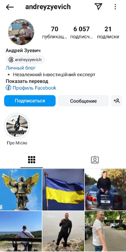 Андрей Зуевич — трейдер из Украины. У него есть аккаунт в Instagram @andreyzyevich, в рамках которого он ведет личный блог. Ранее он также вел телеграмм-канал, но на октябрь 2024 года, видимо, платформа больше не работает. В шапке профиля Андрей заявляет, что является независимым инвестиционным экспертом.