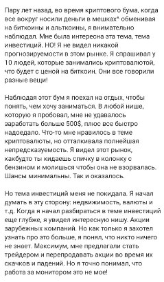 Среди 70 публикаций можно также найти вполне стандартную историю о том, что толкнуло Андрея Зуевича научиться успешно торговать. Рассказ растянулся на несколько длинных постов. Читать подобные материалы интересно разве что для мотивации. Они не дают статистику, не отражают профессиональный уровень трейдера и никак не демонстрируют его экспертизу.