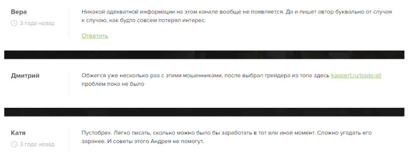 Клиенты негодуют и называют Андрея настоящим мошенником, отбирающим у пользователей деньги. Подобные отзывы — явное свидетельство того, что у трейдера нет экспертизы в вопросах торговли.