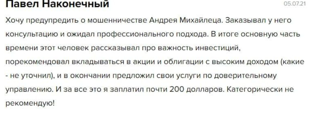 Трейдер работает в сети давно, поэтому можно найти много мнений о работе инвестора. Положительные отзывы об Андрее Михайлец явно носят заказной характер. На независимых площадках много негативных высказываний о Mihaylets PRO Инвестиции. Большинство пользователей возмущены непрофессионализмом Андрея и открыто заявляют о скаме.