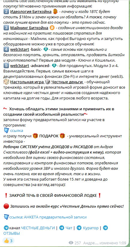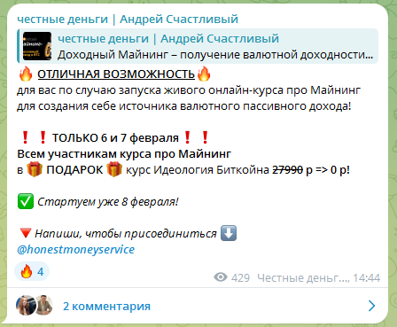 Торговый эксперт ведет курсы по майнингу и трейдингу цифровыми активами. И предлагает подписчикам его площадки в Телеграм записаться на освоение программы обучения. Базовая стоимость обучающих уроков для разных категорий пользователей отличается. Тем, кто купил у трэйд специалиста курс про майнинг, автор продает доступ к программе «Идеология Биткоина» за бесплатно. Тем, кто не потратил свои деньги на покупку учебных материалов Андрея Счастливого о крипте, создатель проекта может продать их за 27 990 рублей. Трейдинг-куратор утверждает, что зарабатывает деньги исключительно на биржевых сделках.