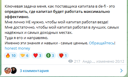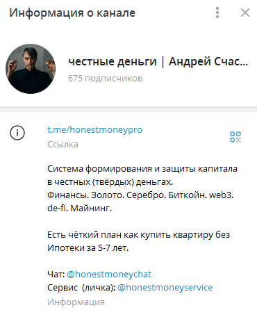 На инвестиционное сообщество Honest money pro подписано 675 пользователей. В профиле тг-клуба указано, что портал посвящен стратегиям увеличения дохода за счет финансовых операций с криптовалютой, драгоценными металлами и децентрализованными биржами. Администратор канала юзер Honestmoneyservice утверждает, что у него есть готовый алгоритм действий для покупки квартиры за 5-7 лет без ипотеки.