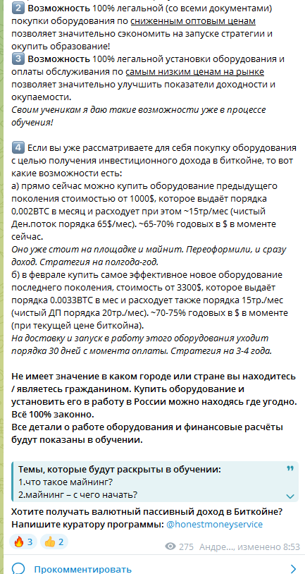 Также опытный финансовый куратор размещает в группе Honest Money информацию об оборудовании для майнинга. Он предлагает написать ему в «личку» и узнать подробности того, как приобрести с помощью автора аппаратуру для добычи монет и начать зарабатывать на крипте.