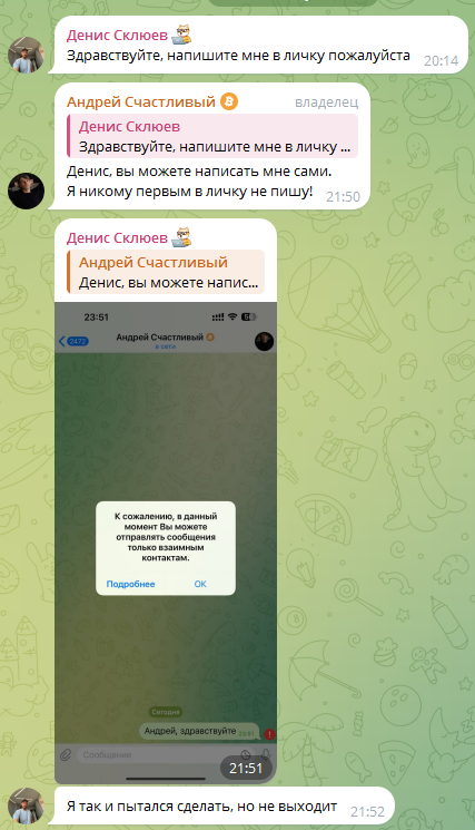 В сети люди не оставляют отзывы о взаимодействии со scam проектом «Честные Деньги Андрей Счастливый». В тг-сообществе фальшивого трейдера мы обнаружили, что люди не могут связаться с владельцем канала.