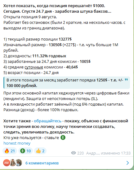 Разработчик стратегии обещает, что покупатели смогут с его помощью организовать пассивный доход на «Биткоине». Организатор trading комьюнити предлагает подписчикам также вступить в телеграм-чат Honest money chat и общаться между собой на этой площадке.