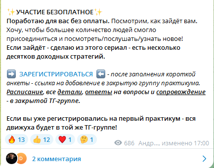 Регулярно посты автора просматривает только 30% подписчиков. Реакций и комментариев под публикациями практически нет. Мы сделали вывод, что владелец проекта вероятно накручивает аудиторию. Ему нежно продать как можно больше доступов людям. В этом заключается смысл его заработка. У доверчивых юзеров при виде многочисленного сообщества может создаваться положительное впечатление об организаторе и возникнуть желание приобрести у него материалы.
