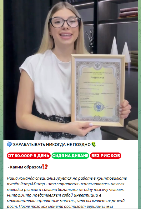 Анна утверждает, что все депозиты застрахованы, и участники могут получить дополнительную гарантию безопасности через «страхового агента». Первым шагом является сбор средств под предлогом участия в пампе криптовалюты. После предполагаемого роста стоимости монеты, деньги якобы распределяются между участниками. Однако на практике клиентам приходится сначала внести мошеннице еще деньги. Это плата за вымышленного «страхового агента» и еще какие-то суммы якобы под предлогом уплаты налогов.