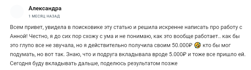- Отрицательные отзывы об инвестициях с Анной в телеграмме от обманутых клиентов.