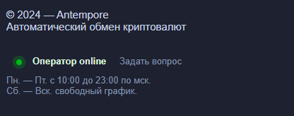 Никаких контактов в проекте Antempore com, который в Сети называют скамом, нет. Авторы только рассказали внизу, что у проекта есть техподдержка, работающая в режиме онлайн. Операторы всегда висят с пометкой «В Сети» независимо от указанного времени работы.