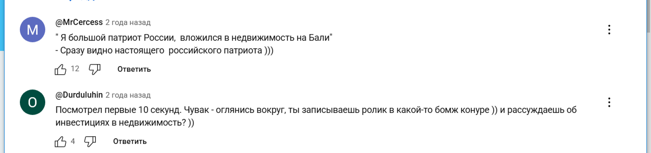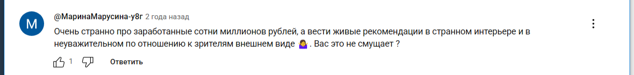 При этом большинство сомневается в заявленных доходах инвестора и в его опыте. Скептики интересуются, почему бизнесмен с доходом более полутора миллионов снимает видео в обшарпанных комнатах и растянутых майках.