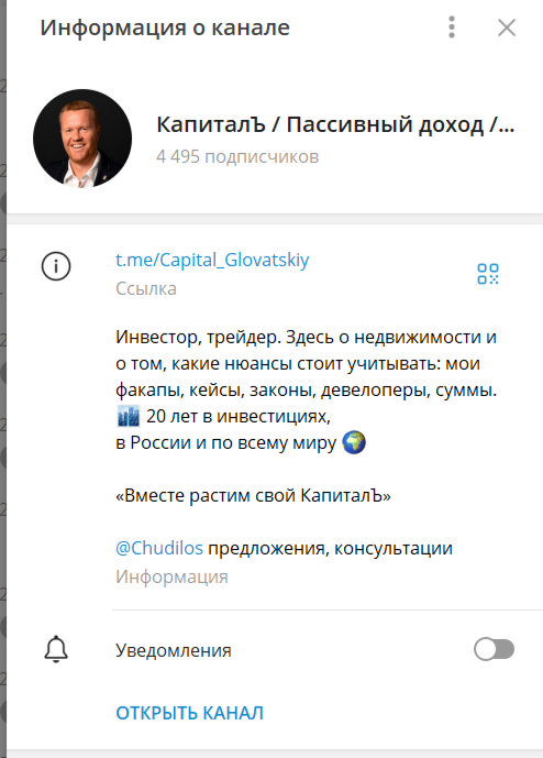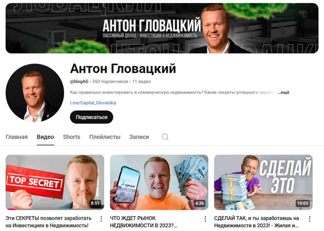В 2019 году в Телеграме появился канал, посвященный инвестированию в недвижимость. Автор, Гловацкий Антон Евгеньевич, рассказывает что имеет колоссальный опыт в инвестировании. По его словам, он ежемесячно получает более полутора миллиона рублей в качестве пассивного дохода. Кроме этого, Антон торгует криптовалютой, имеет несколько бизнес-точек и занимается перепродажей объектов недвижимости.