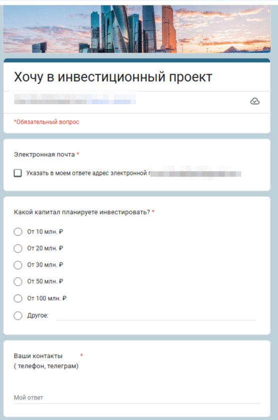 Ни в одном из своих сообществ Антон Гловацкий не предлагает платных услуг. Он не занимается обучением или индивидуальным консультированием. Часто на канале появляется реклама некоего инвестиционного клуба «Деньги». Автор рассказывает, что здесь можно познакомиться с полезными людьми, обменяться опытом и просто приятно провести время. При этом не публикуются ссылки на сообщество или призывы вступить в клуб.Часто трейдер приглашает к сотрудничеству. Предлагается инвестировать в различные проекты и недвижимость. Чтобы уточнить подробности, нужно писать в личные сообщения chudilos. Еще один вариант связи – заполнение гугл-формы. Пользователям предлагают оставить свои данные и выбрать сумму, которые они готовы вложить в проект.