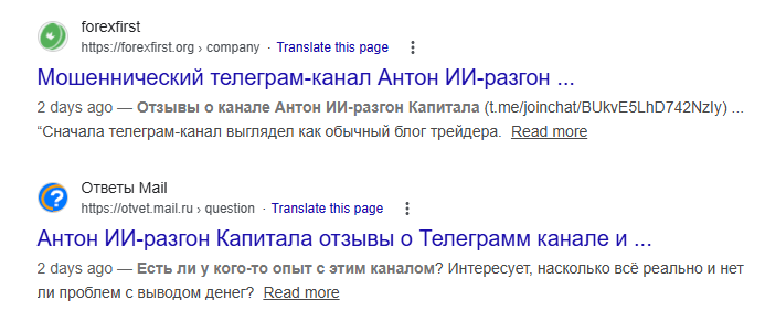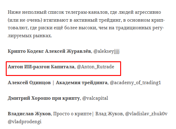 ТГ канал Антон ИИ разгон капитала уже обзавелся репутацией лохотронщика и попал в черные списки крипто аферистов. Подобные менторы предлагают торговать по реферальной ссылке, а итогом сотрудничества становится слив депозита по сигналам-пустышкам. При этом, чтобы убедить участников, Антон заверяет – сотрудничество взаимовыгодное, ведь он якобы получает процент от прибыли приглашенного на площадку трейдера. По факту комиссия Антона более щедрая от потери капитала участника.