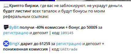Раз в несколько дней Aram crypto опубликовывает посты о том, какими биржами лучше всего пользоваться как опытным, так и начинающим криптоэнтузиастам. Речь всегда идет о ByBit или BingX. На каждой из площадок у трейдера уже есть аккаунты. Для тех, кто не еще не зарегистрирован на этих криптобиржах создатель Телеграм-канала предлагает свои реферальные ссылки.