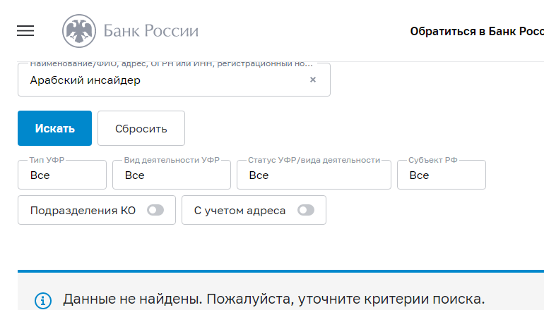 В реестре легальных финансовых организаций Центрального банка РФ данных о криптопроекте «Арабский инсайдер» нет. Это свидетельствует о том, что трейдер работает в серой зоне. Клиенты проекта находятся в потенциально уязвимом положении.
