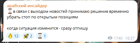 Ежедневно в новостной ленте Телеграм-канала «Арабский инсайдер» выходит один – два сигнала. Трейдер отписывается на старте торгов и делится с подписчиками результатом. Графики сопровождаются краткими комментариями, по которым невозможно понять, являются ли скриншоты результатом интеллектуального труда этого трейдера или же взяты из открытых источников.