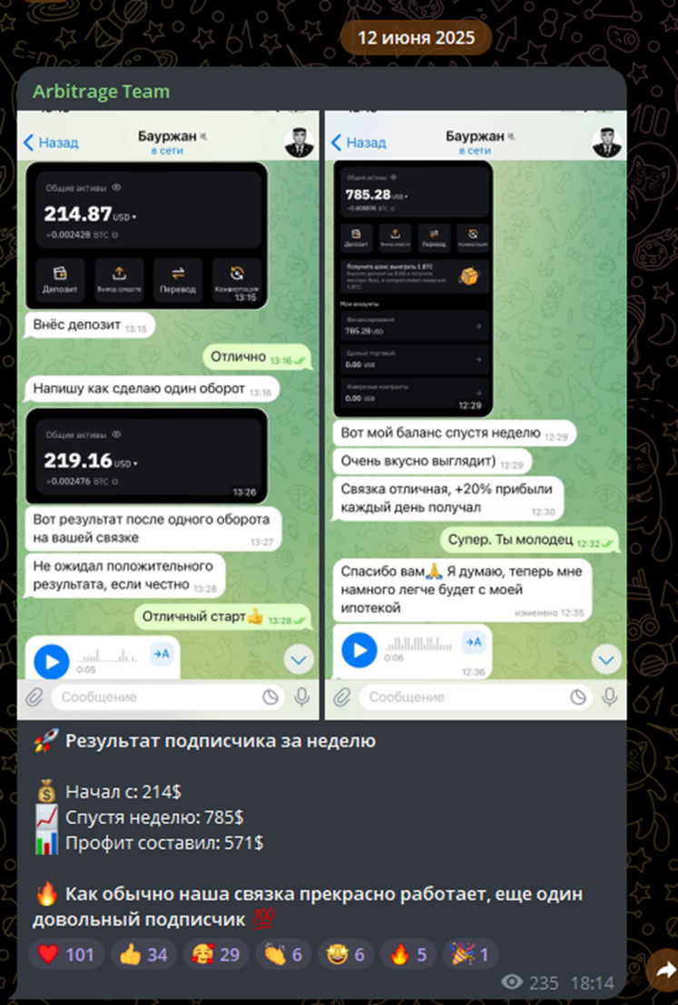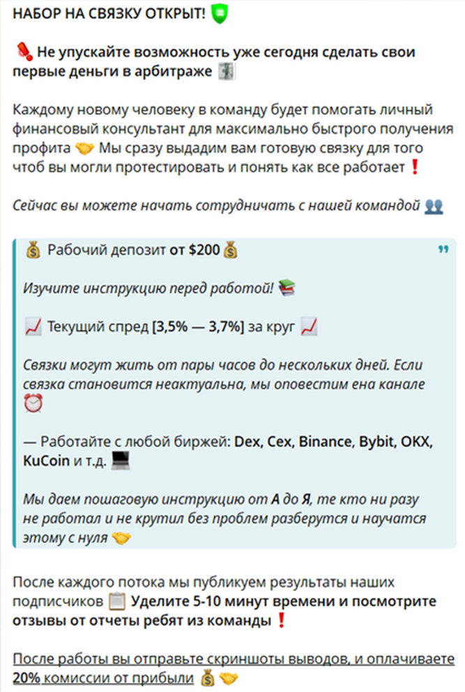 Команда Арбитраж (трейдер Марк) позиционирует себя в качестве эксперта в области заработка на крипте. Потенциальным клиентам обещает высокий заработок, обучение и проверенные стратегии. Однако доказательств успешной работы нет, независимые отзывы об Arbitrage Teame Эксперт по Арбитражу в сети не найдены. Схема работы этой команды выглядит подозрительно, видны признаки лохотрона.