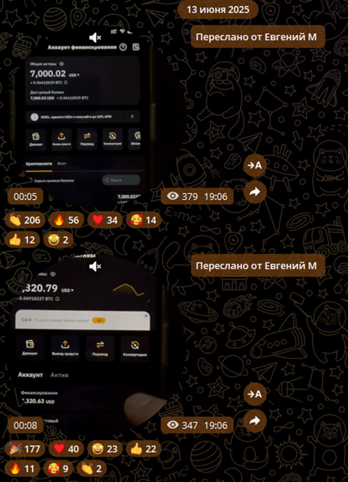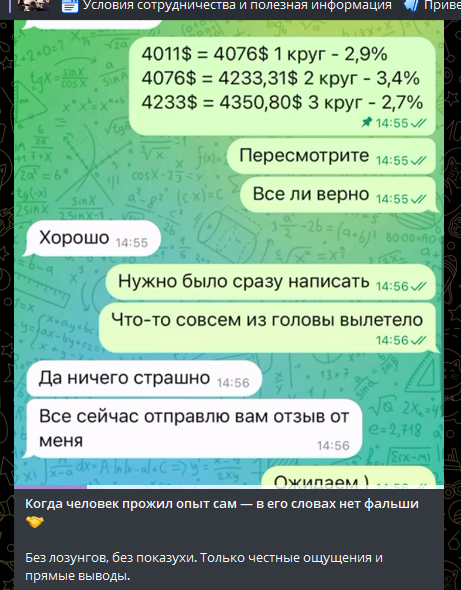 Вместо правдивых отчетов на канале публикуются скрины якобы переписки с клиентами. Трейдер показывает высокие доходы, благодарности. Но независимые отзывы на внешних ресурсах не найдены. На тематических форумах ничего не говорится о такой команде или организаторе проекта Марке.