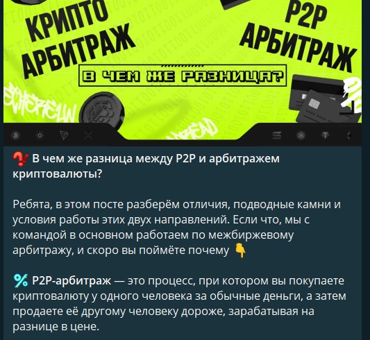 Канал был создан в начале 2025 года. Его владельцы ничего о себе не рассказали, с первых же постов начали нахваливать арбитраж крипты как способ заработка. Они утверждают, что делают огромную прибыль, прокручивают десятки тысяч долларов, живут в свое удовольствие и готовы помогать зарабатывать своей аудитории.